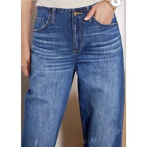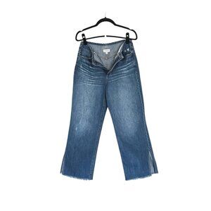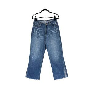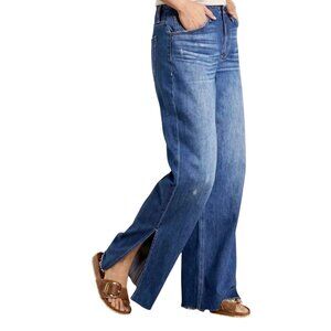 Evereve Medium Blue Wash Ever Slouchy High Waisted Flat Front Contrast Topstitching Classic Five Pocket Styling Whiskering Distressing Relaxed Fit Wide Leg Raw Split Side Hem Jeans Denim Size 28 - Excellent condition.