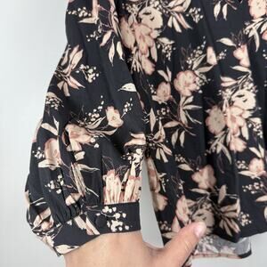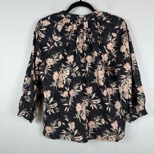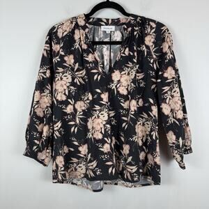 Evereve Floral Blouse Women XS Black Cream 3/4 Sleeve V-Neck Boho Cottagecore