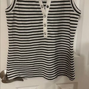 Chic sleeveless top with bold stripes. Features a crisp collar and button accents.81% polyester 15% linen 4% spandex. In mint condition.