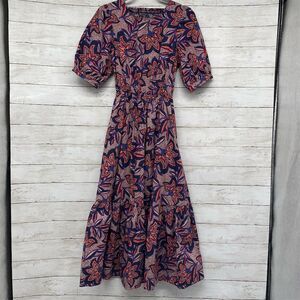 Keywords: Evereve, floral dress, open back, puff sleeve, maxi length, women's fashion, multicolor, cotton dress, machine washable, Vietnam, pre-owned dress, size small.