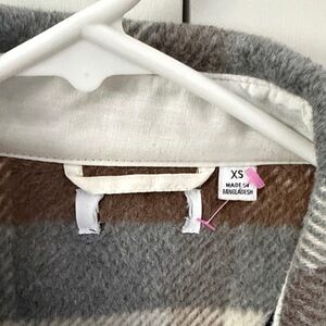 Classic plaid long shirt jacket in brown, gray, and cream. Button-front design with flap chest pockets and front pocket. Soft, warm fabric ideal for layering on cool days. Straight hem and relaxed fit for comfortable everyday wear. Women’s xs.