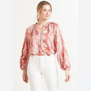 Evereve Smocked Neck Statement Blouse Size XS Kiera Coral Floral Artsy Flowy