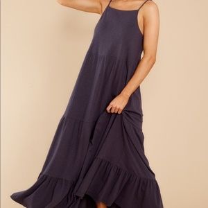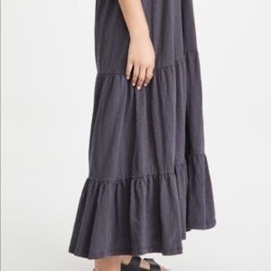 The Rory Tiered Dress is made from 100% cotton Slub jersey knit that flows with ease and is crafted for the summer season. This maxi-length dress is designed with a square neckline, adjustable spaghetti straps, and tiers throughout skirt with heavy shirring. New With Tags. Aged black/ Dark charcoal grey color