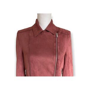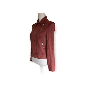 Beautiful faux suede moto jacket with zippered front pockets. Mauve/blush color. Size XS. No sign of wear, excellent condition
