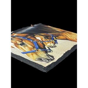 Beautiful wall hanging from Evergreen featuring a tender portrait of a mother horse and foal, painted on natural slate. Realistic brushwork with blue halters and flowing mane, signed by artist Jean Gregory Smith. Comes with leather strap for easy hanging. Measures approximately 9.75" × 8".