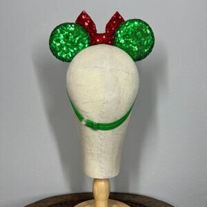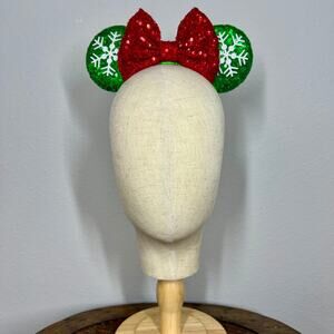 These festive Disney-inspired ears feature green sequins with glittery white snowflake details, and topped off with a bright red sequin bow. These ears are perfect for getting into the holiday spirit, whether you're celebrating at the parks or adding festive flair to your winter outfit! 🎄⛄️