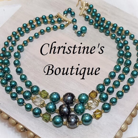 Evergreen green and crystals 3 strand choker vintage necklace