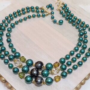 Vintage 3 Strand Christmas Green Beaded Necklace