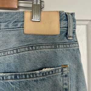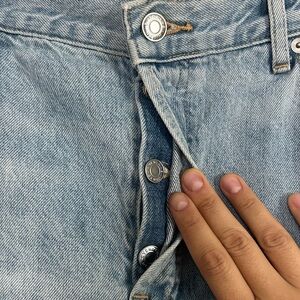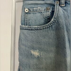 Classic light blue jeans with a cheeky fit with crop fit. Cute double patched on knee. Made from organic cotton. Women’s large size 31 waist
