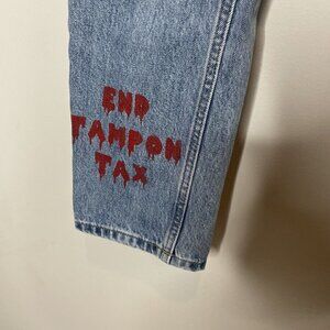Excellent used condition. No flaws. One of a kind details on jeans “end the tampon tax” and flower painted detail. Will not fade or wash off.