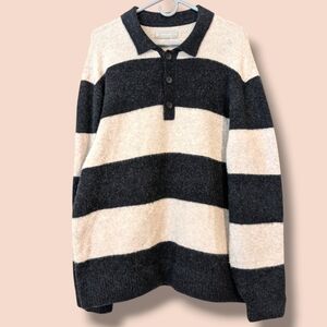 Everlane Black Cream Stripe Stretch Wool Rugby Polo Sweater XL Machine Washable