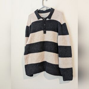 Everlane Black Cream Stripe Fuzzy Stretch Wool Relaxed Henley Rugby Polo Sweater Preppy.