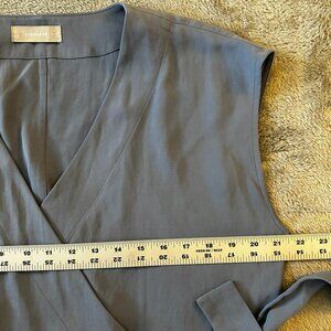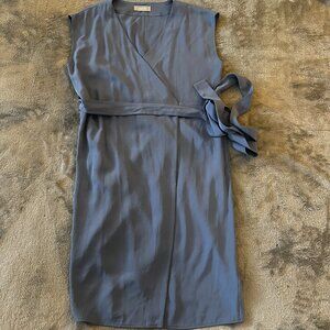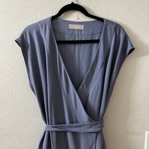 Elegant blue midi dress. Features a wrap design. Cap sleeves and waist tie.
