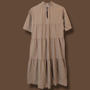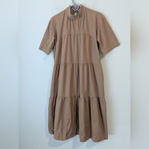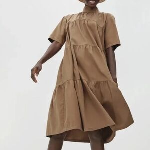 Everlane Brown Poplin Cotton Mock Neck Short Sleeve Tiered Flowy Midi Dress Church Modest.