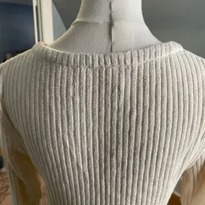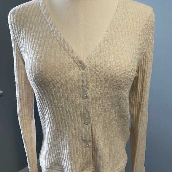 Cropped cream cardigan with ribbed texture. Features a classic button-up front. Ideal for layering. Has slightly flared sleeves.