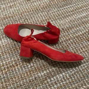 Loved these but they haven't been in rotation for a while. They're a great easy pop of color. Poppy red! They fit like a flat but with a comfy 2" block heel- elastic at heel is genius if you've got a slightly narrow heel like me. Made in Italy. Suede leather.