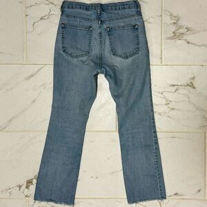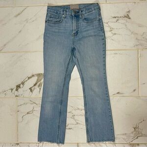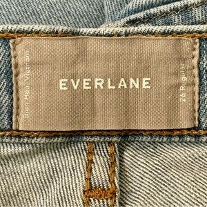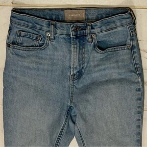 Everlane distressed jeans, frayed hem, ankle length, size 26. Measures 13.5” across the waist and has an inseam of 25.5”. Good preowned condition, no flaws, stains, tears but have been good and broken in.