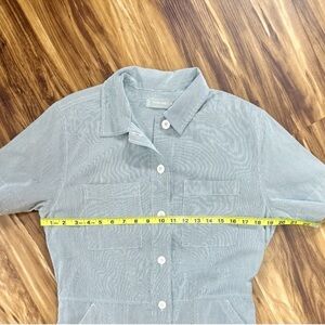 Experience effortless style with this Everlane blue and white striped romper, featuring a classic collar and a relaxed fit. Front and back pockets.Its soft, breathable fabric makes it ideal for warm weather, offering both comfort and versatility for casual occasions.