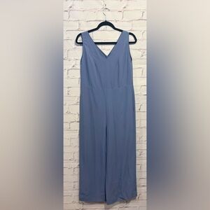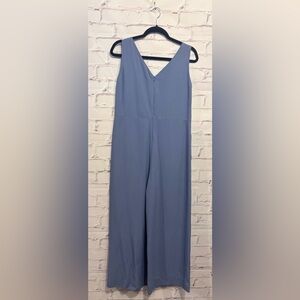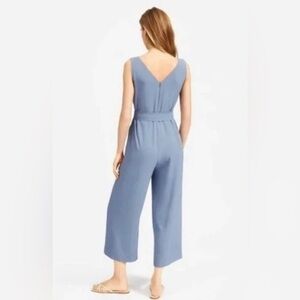 Sleek and minimalist, the Everlane Japanese GoWeave Essential Jumpsuit offers effortless sophistication in a lightweight, wrinkle-resistant fabric. Designed in a soft light blue hue, it features a flattering V-neckline, sleeveless cut, and straight wide-leg silhouette for a modern, polished look. Perfect for work, travel, or special occasions. Note: Missing belt.
