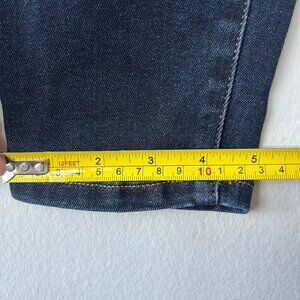• Details: High rise, skinny leg, dark wash, mid-blue with deep tones