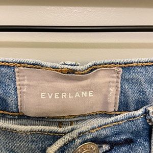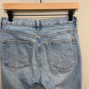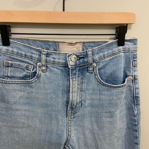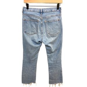 Stylish straight leg jeans. Light blue denim. Frayed hem detail. Classic five-pocket design.