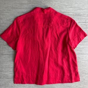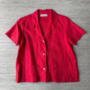 The Everlane Linen The Notch Shirt Button Up in red is a stylish and versatile women's top perfect for casual occasions. Made from 100% European Flax Linen, this short sleeve crop blouse features a notched collar and button closure. With a relaxed fit and a solid pattern, this top is machine washable and easy to care for. Ideal for summer, fall, and spring, this top adds a touch of sophistication to any outfit with its red color and button accents.
