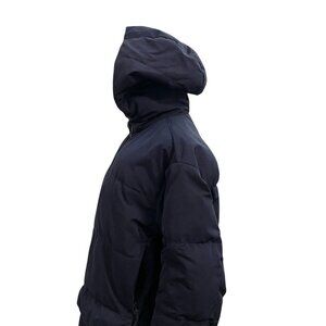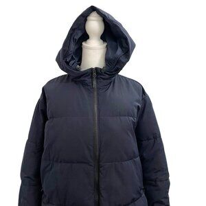 Everlane Long Quilted Puffer Coat Jacket Patch Pocket Hood Navy Blue size Small
