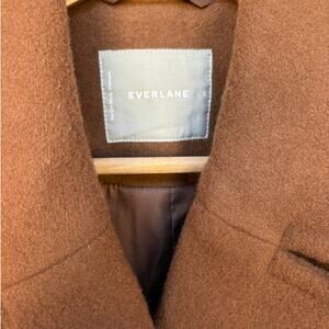 Everlane jacket in good condition with light wear and no stains, rips or tears. There is a small "knot" in the fabric on left front - see photo - that's very hard to see. No other blemishes noted. This modern variation of a classic style makes it the perfect fall jacket. The warm colored fabric feels thick and substantial. Measures app'x: 21 inches pit to pit, 20 across bottom and 23 long.