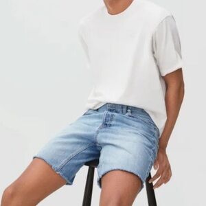 Everlane Men's Denim Cut-Off Shorts. Size 34. In good preowned condition. No stains. Lighter wash. Buttonfly. Frayed hems. Waist measures 34 inches. Inseam 8 inches. Comes from a smoke free home.