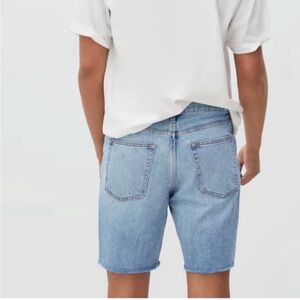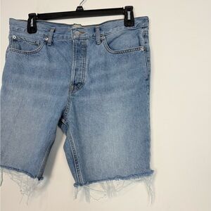 Everlane Men's Denim Cut-Off Shorts. Size 34. In good preowned condition. No stains. Lighter wash. Buttonfly. Frayed hems. Waist measures 34 inches. Inseam 8 inches. Comes from a smoke free home.