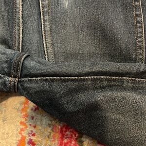 Jeans are slightly different in color than the stock image shows. Look to rest of pictures for proper color. Good pre-owned condition. Small hole on the left lower bottom/upper thigh. Wear on inner thighs. Both shown in pics.