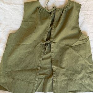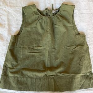 Everlane high-neck, open-back tank with cinching detail at the neckline and made of crinkly crepe fabric.