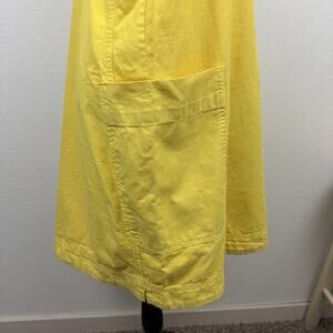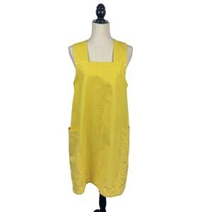 Organic cotton denim, sunny yellow, pullover styling, straight fit, front patch pockets, criss-cross back, size medium.