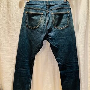 Great pair of Everlane Organic Cotton Selvedge Slim Fit Jeans in Deep Indigo. Super comfortable with a soft feel, natural fading, and just the right amount of stretch — not stiff or starchy like raw denim.