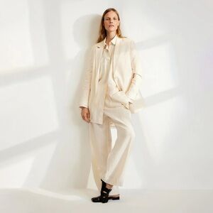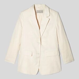 Elevate your wardrobe with this Everlane Oversized Linen Blazer in a soft ivory shade. Crafted in a heavyweight stretch linen blend, this jacket features a single-breasted silhouette, two-button closure, flap pockets, cuff buttons, and full lining for a polished, structured look. The relaxed oversized fit makes it perfect for layering and effortless year-round styling.