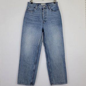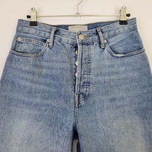 Women's Everlane "90's" ultra high rise cropped button fly jean a light blue wash with whiskering and fading. They are pre-owned, and are in excellent condition showing minimal wear overall.