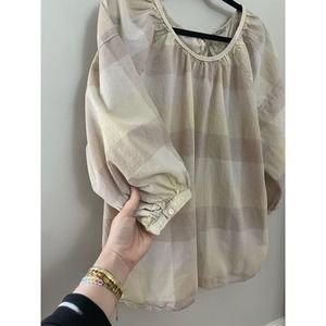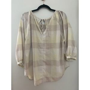 Everlane Ruched Air Peasant Blouse Top 12 Oversized Toffee Plaid Boho Keyhole