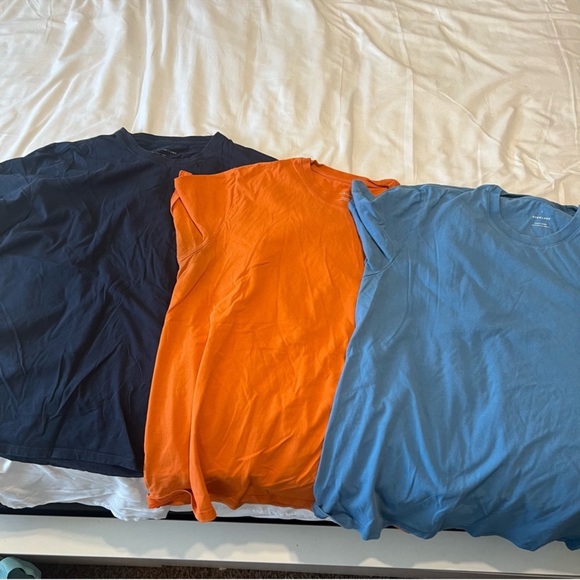 Set of three Everlane short sleeve tees. Includes navy, orange, and light blue colors. Comfortable and stylish.