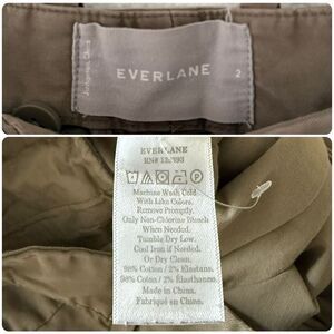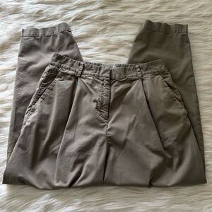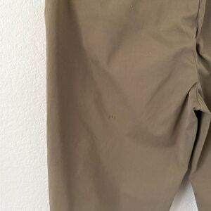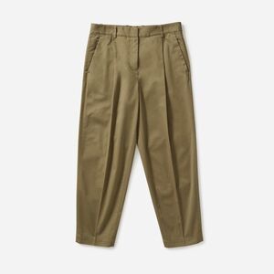 The Slouchy Chino Pant by Everlane in Green/Brown. Two front hand pockets, two back welt pockets. Belt loops. Pleats at front. Cropped length. Preowned with tiny hole at back near side seam and faint mark at back of pant leg as pictured. Size 2.
