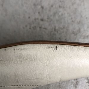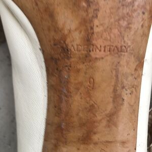 Ballet slipper style, kitten heels, 2 inches. Please look at the pictures they’re not perfect but they’re still good. On the left foot looks like three little arches. Is it cutting the leather it could be sanded or glue down. You could also restain these shoes a different color and they would look like new. Made in Italy. Color is a winter white.