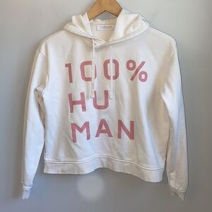 Featured here is our 100% Human Typography Hoodie. It’s made of the same tightly spun 12 oz cotton as our classic french terry sweatshirts and has the same boxy fit, but what sets it apart is exclusive, large-scale 100% Human typography.
