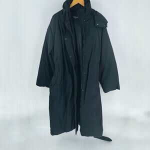 Stay cozy and stylish with this Everlane long black belted puffer coat in women’s size XL. Features a sleek minimalist design with a tie belt at the waist, front snap and zip closure, and warm down insulation made from 100% recycled materials. Designed for both comfort and sustainability.