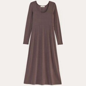 Maxi length, long-sleeve, scoop neck, with a curved waist seam that dips at the back, and a body-skimming fit. Made with Butterknit fabric, it has a super soft, stretchy, drapey feel with a little sheen.