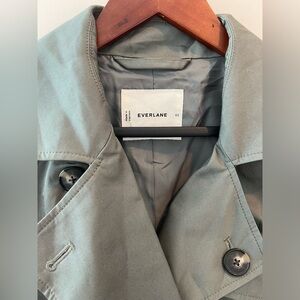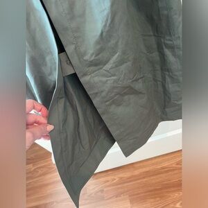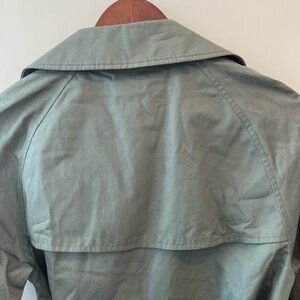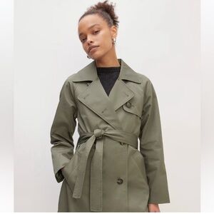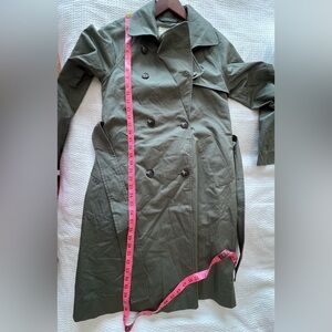 This piece features a double-breasted front with button closures and a belt, long sleeves, a front storm flap detail-with a full back storm flap, slanted welt pockets, and a back vent with button tab detail. Fully lined, it's made with 100% organic cotton on the coat itself and