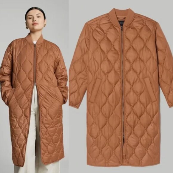 Everlane The Renew Long Liner Quilted Jacket Size L, Tawny Brown EUC