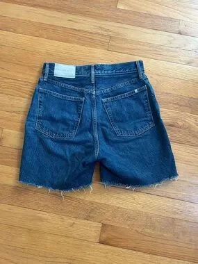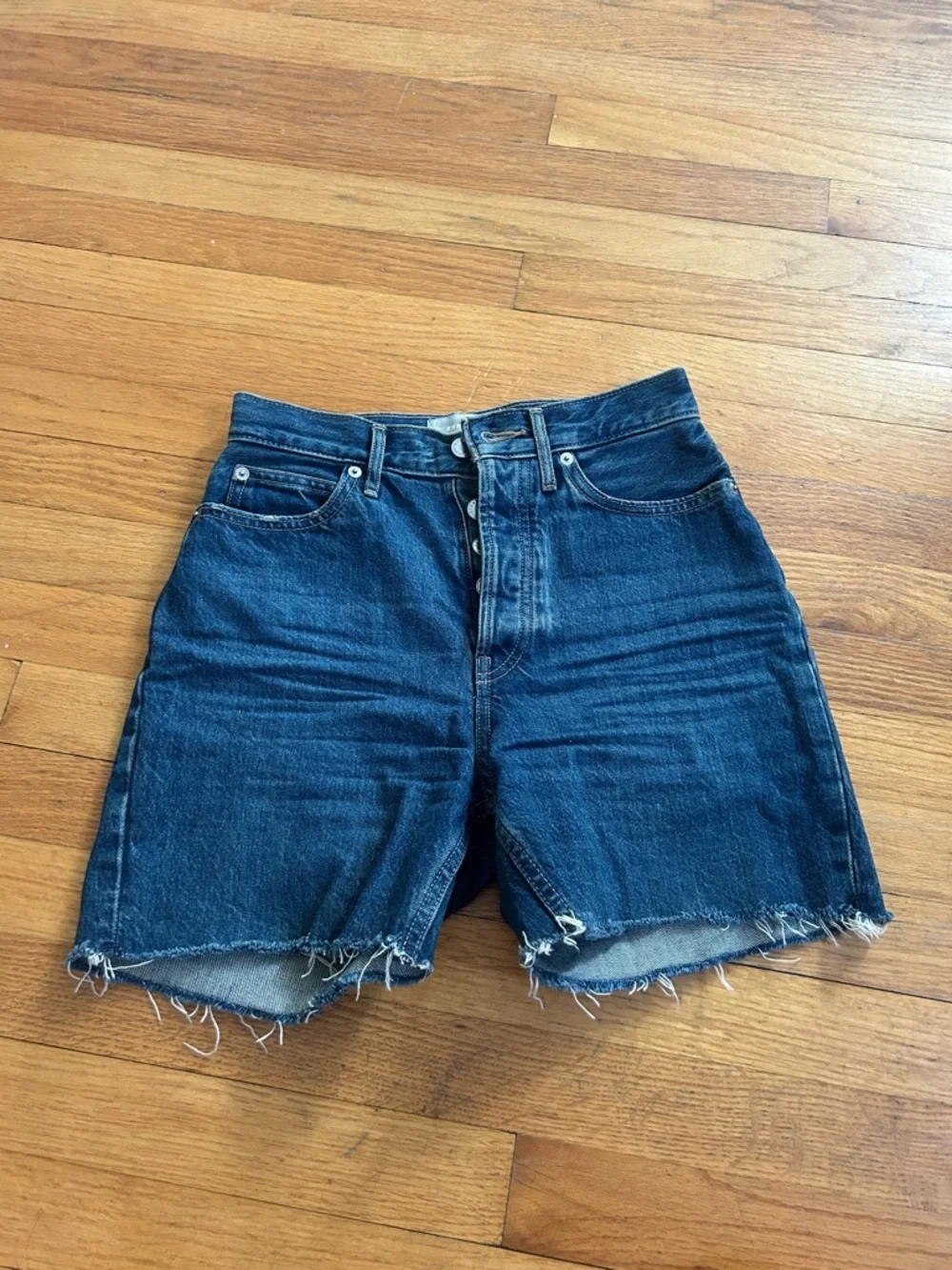 High-rise denim shorts in a deep blue wash. Quality stiff, organic cotton. Raw frayed hem with a slightly distressed look, worn only a handful of times. Button fly and classic five-pocket styling. Casual, versatile piece for everyday outfits.