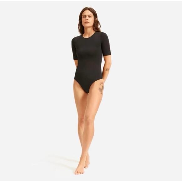 Everlane The Short Sleeve Crew Neck Bodysuit thong black. New with tag. Size S shown, but multiple sizes available. Hygienic liner in tact. Snap crotch closure. First 6 photos are stock photos to show fit and detail only.