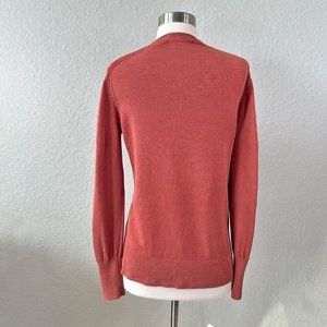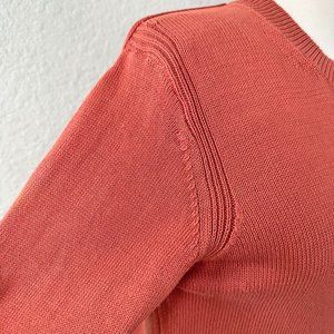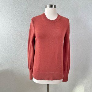 Everlane The Soft Cotton Crew Sweater in Spanish Clay. Knit crewneck sweater with ribbed details. 100% cotton. Clay red/orange color. Hem is shorter in front.