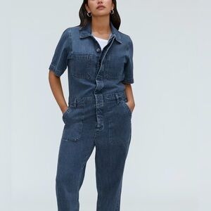 Versatile blue denim coveralls by Everlane. Made from organic cotton. Button front short sleeves casual chic look.