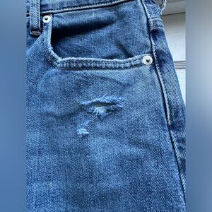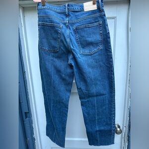 Everlane, The Way High Jean, straight leg, style “distressed,” in size 28. The extra high rise 98% organic cotton and 2% elastane hold you in the right places while offering a smidge of stretch. The inseam is 25.5 inches or ankle length.